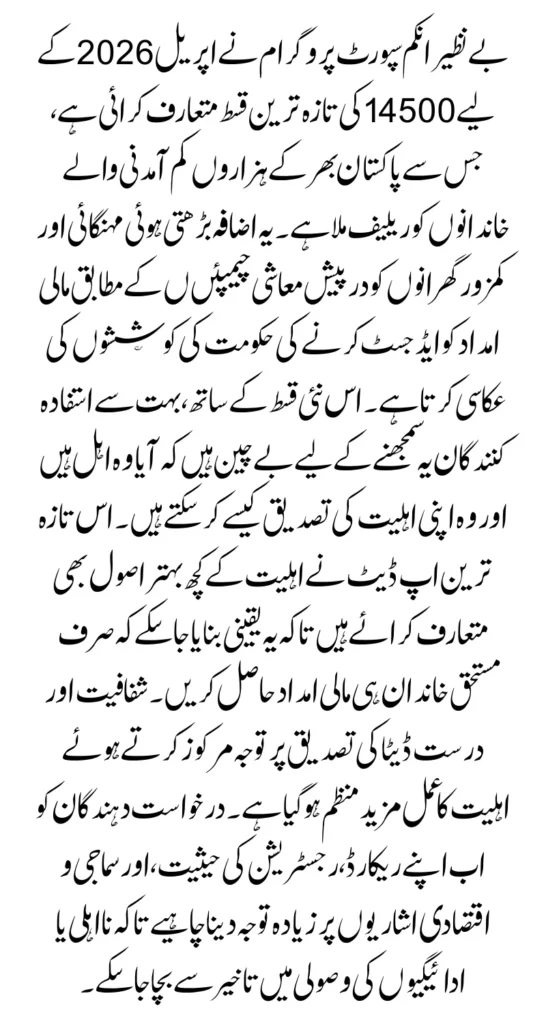 The BISP 14500 April 2026 installment is a significant step toward supporting low-income families in Pakistan. With updated eligibility criteria and improved verification systems, the program aims to ensure transparency and fairness in the distribution of funds. Applicants must stay informed, keep their records updated, and follow proper procedures to benefit from this financial assistance.