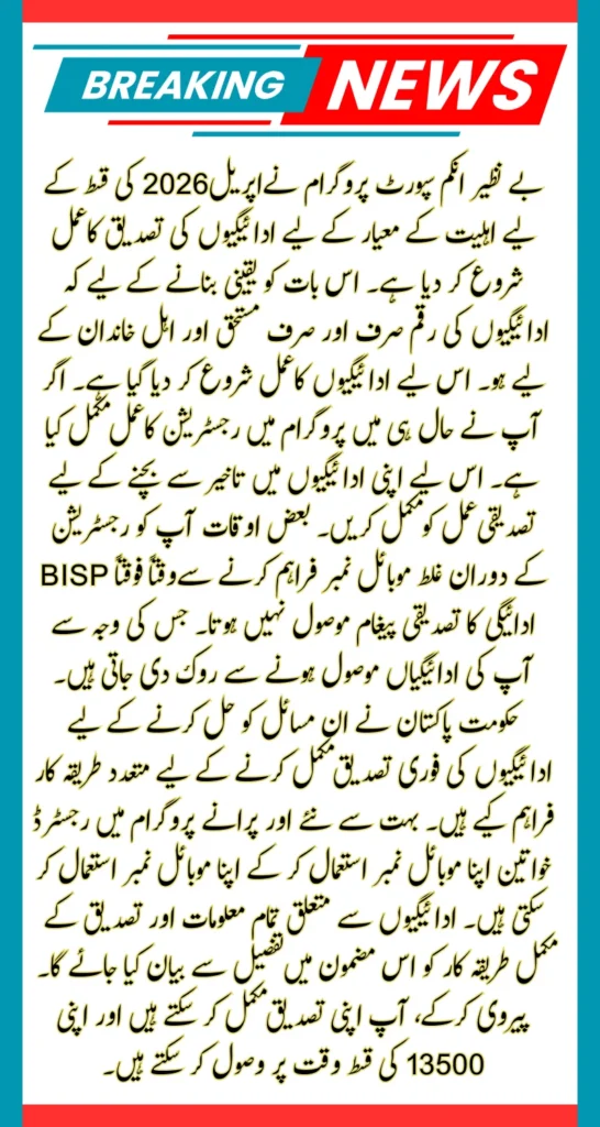 BISP April 2026 Payment: Benazir Income Support Program has started the process of verifying payments for the eligibility criteria for the April 2026 installment. To ensure that the payment amount is only for the deserving and eligible family. Therefore, the payment process has been started. If you have recently completed the registration process in the program. Therefore, complete the verification process to avoid delays in your payments. Sometimes you do not receive the BISP payment confirmation message from time to time due to providing the wrong mobile number during registration. Due to which your payments are blocked from receiving.
