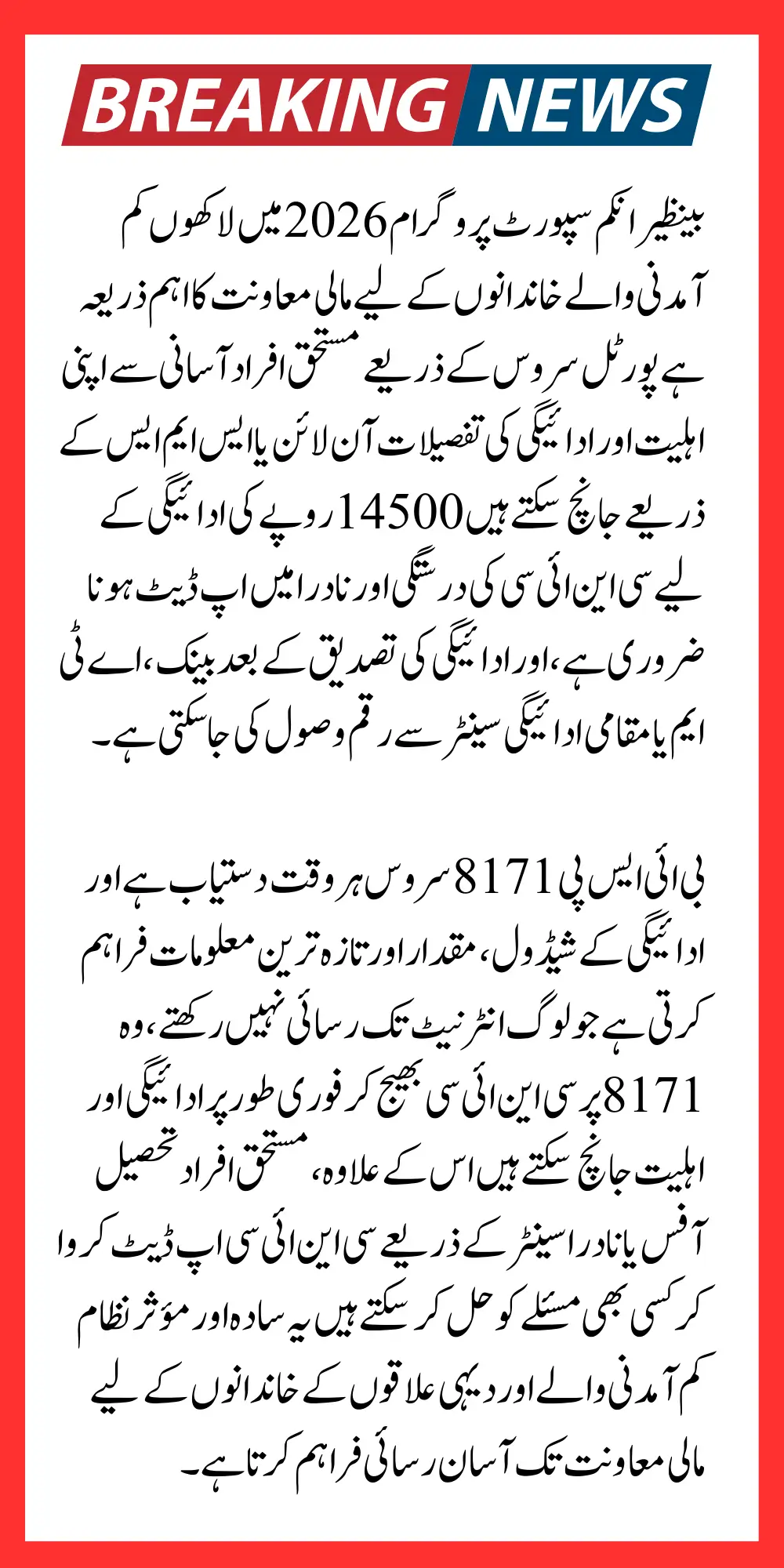 | Check via SMS | Send CNIC to 8171 to receive instant eligibility and payment info |