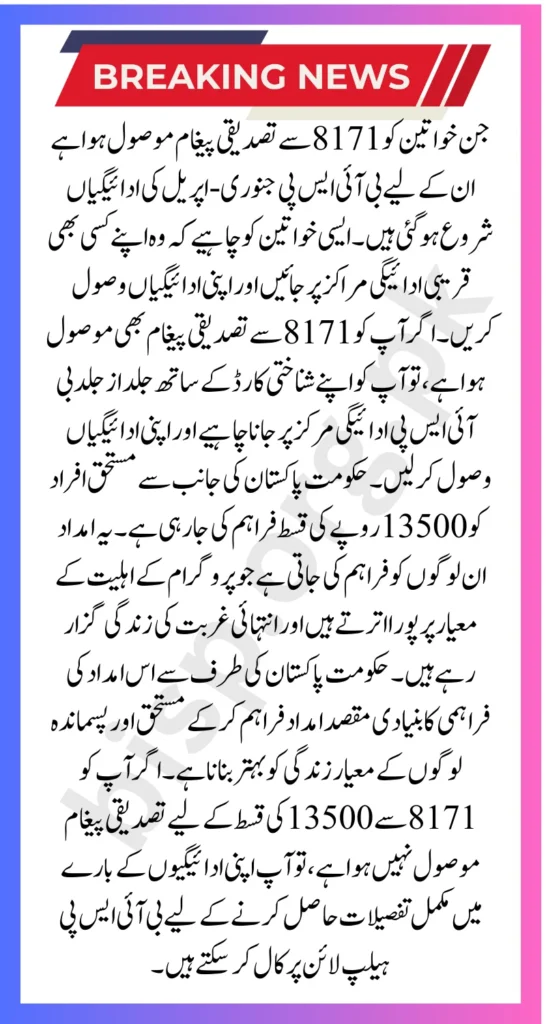 If you have received a payment SMS from BISP with the verification code 8171, then you are eligible for BISP payment. And you can receive your payments immediately from any of your bank accounts or from the payment center. These payment methods are designed to ensure that the beneficiaries can receive their money in a transparent manner without any hassle. The installment of 13500 is being provided only to those women who have received the confirmation message from BISP. While women who have not received this message also need not worry at all. They can check the amount of their payments by contacting the SMS service or the helpline. If their installment has been received, they can receive their money immediately. If your district is not included in the first phase of payments, then you can receive your installment of 13500 after your district is included in the second phase of payments. For complete information regarding your payments and eligibility, call the BISP Helpline or visit the BISP Tehsil Office.