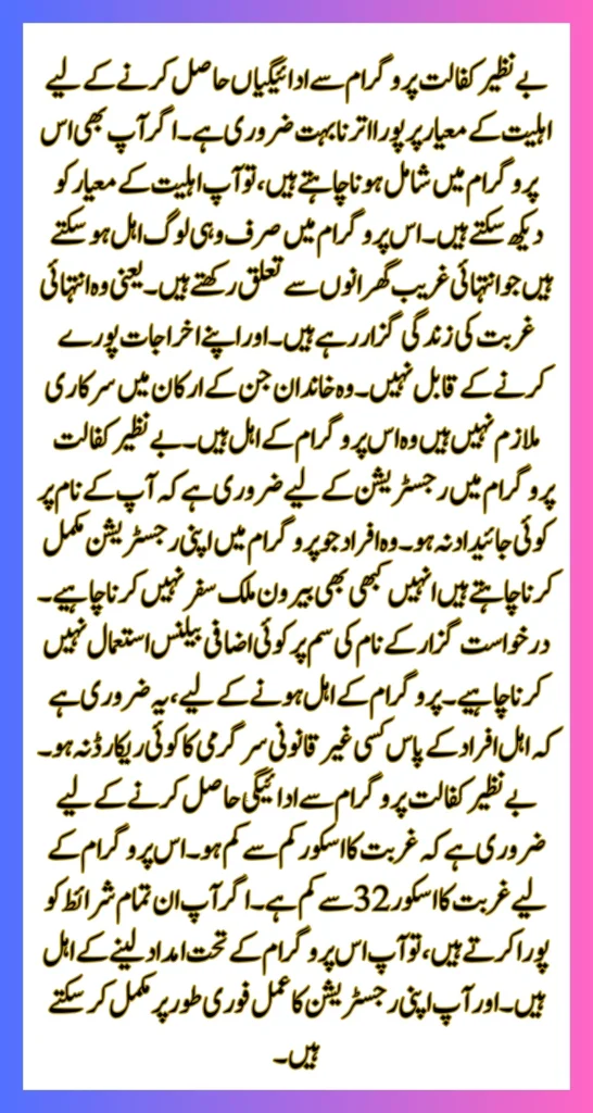 No excess balance should be used on the SIM which will be in the applicant’s name. In order to be eligible for the program, it is essential that the eligible persons have no record of any illegal activity. In order to receive payment from the Benazir Kafalat program, it is necessary that the poverty score should be minimum. The poverty score for this program is less than 32. If you fulfill all these conditions, then you are eligible to take assistance under this program. So you can immediately complete your registration process.