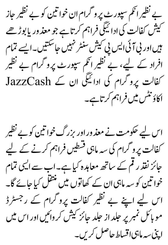 The Benazir Income Support Program provides Benazir JazzCash Kafaalat Payment to women who are disabled or elderly and cannot go to the BISP Cash Centre. For all such persons, the Benazir Income Support Program provides Benazir Kafaalat Program payments in their JazzCash accounts.