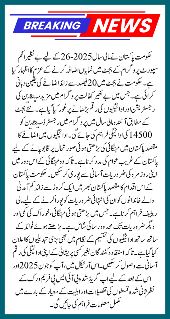 The budget for the fiscal year 2025-26 has announced under the Benazir Income Support Program. According to which the program payments will increased from 13,500 to 14,500. In addition, nine lakh new families have also assured of registering in the program. All those who are registered in the program will be able to receive the installment of 14,500 from June 2025. But all those who have not yet completed the registration process can get themselves registered by June 30 and become eligible for the program. But all those who do not complete their verification process before June 30 will be declared ineligible for the program. Therefore, to maintain your eligibility, update all your information in BISP first.