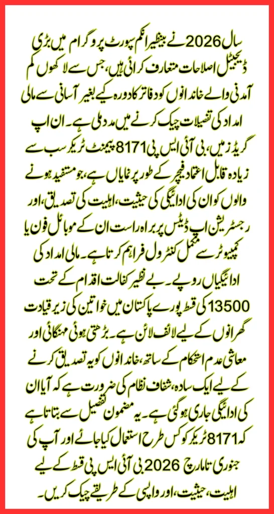 The Rs. 13,500 installment under the Benazir Kafalat initiative is a lifeline for women-led households across Pakistan. With rising inflation and economic instability, families need a simple, transparent system to confirm whether their payment has been released. This article explains in detail how to use the 8171 tracker and check eligibility, status, and withdrawal methods for your Jan–March 2026 BISP installment.