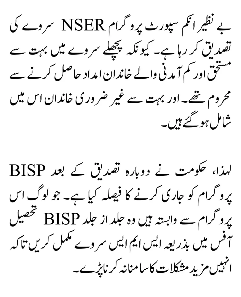 So, the Government has decided to release the BISP program after re-verification. Those who are associated with this program should complete the survey via SMS at the BISP Tehsil Office as soon as possible so that they do not have to face any further difficulties.