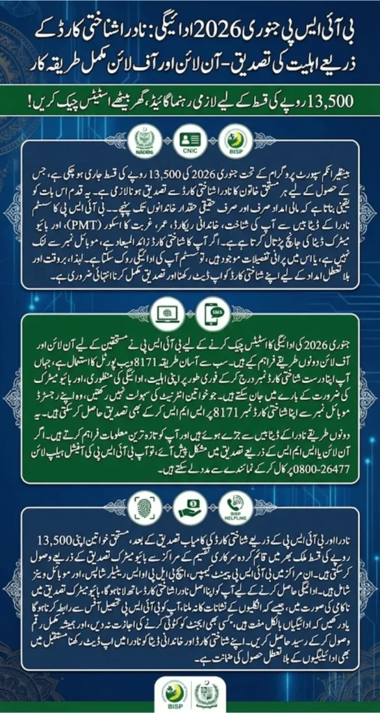 BISP Payment & Eligibility Verification: The Benazir Income Support Program continues to support millions of deserving families across Pakistan, and the January 2026 installment of Rs. 13,500 has now begun. However, before receiving this assistance, every beneficiary must complete their NADRA CNIC verification to confirm eligibility and activate payment release. Many women, especially from rural districts often find the verification process confusing. Therefore, this complete guide explains each step in simple language, covering all online and offline methods to check your BISP January 2026 payment status using your NADRA-issued CNIC.