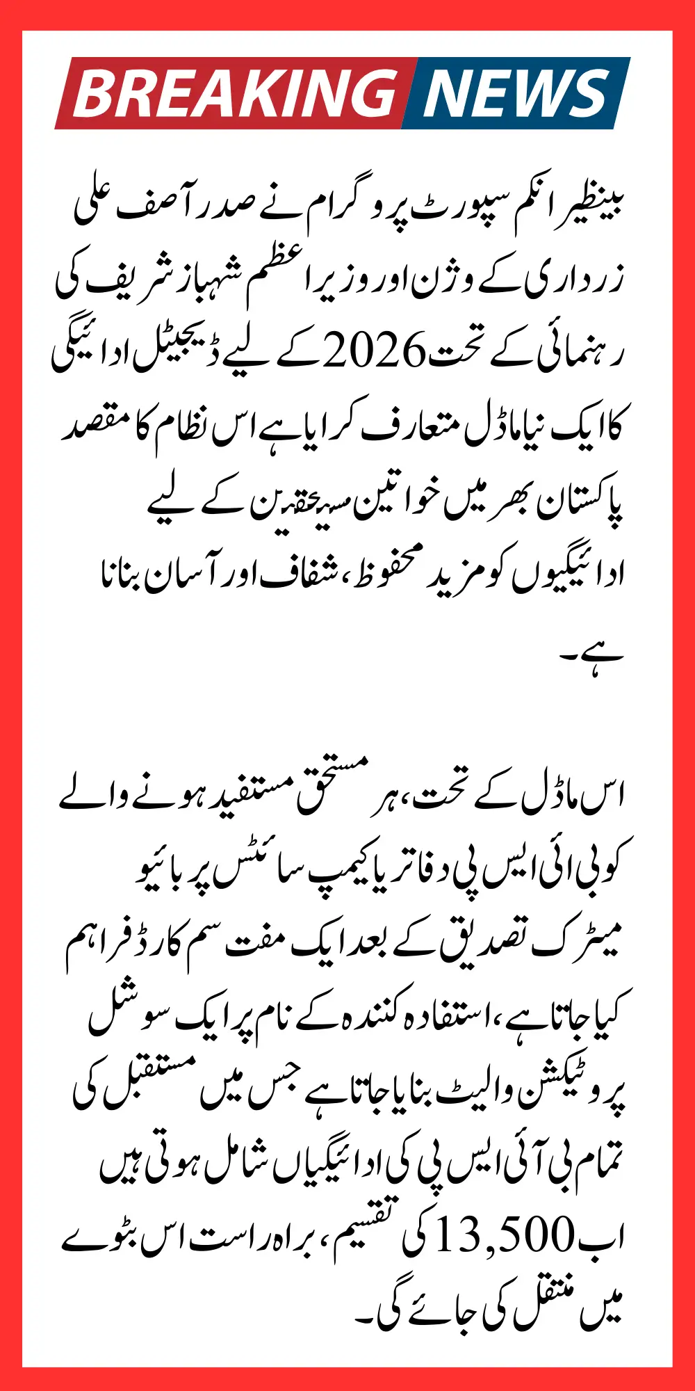 Under this model, every eligible beneficiary is provided a free SIM card at BISP offices or camp sites after biometric verification, a Social Protection Wallet is created in the beneficiary’s name all future BISP payments, including the Rs. 13,500 2026 disbursement, will be directly transferred to this wallet.