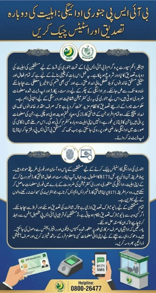 The BISP January payment reconfirmation process is a critical step to ensure that financial assistance reaches the right beneficiaries on time. By completing your CNIC verification, updating biometric data, and checking your status via the 8171 portal or SMS, you safeguard your eligibility and prevent unnecessary delays. Staying informed about authorized payment centers and keeping all required documents ready can make the process smoother and faster.