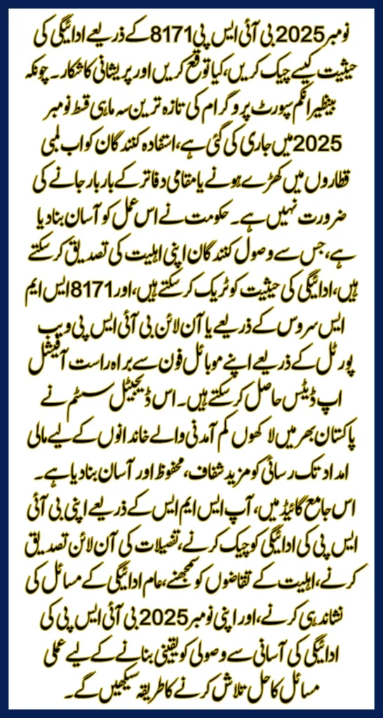 The November 2025 payment cycle for BISP through the 8171 service offers a transparent, accessible route for registered beneficiaries to verify eligibility, check payment readiness, and receive funds with minimal hassle. Whether you opt for the SMS method or the online portal, the system is designed to bring support closer to you.