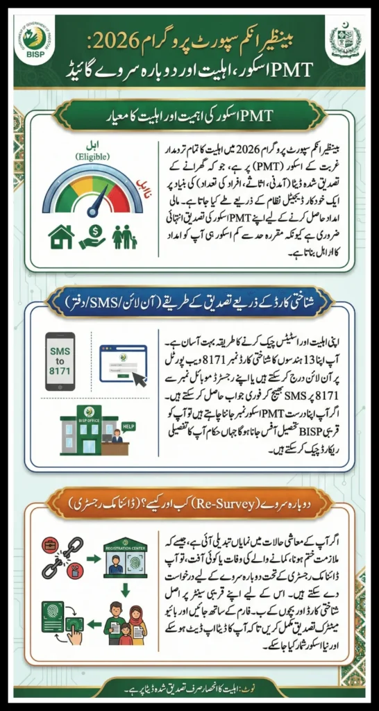 BISP 2026 PMT Score Verification Via CNIC Eligibility Criteria & Re-Survey Process is an essential guide for families who want to confirm their qualification for financial assistance under the Benazir Income Support Program. In 2026, eligibility decisions are strictly based on the Poverty Means Test (PMT) score, which is calculated through verified household data. Many applicants receive eligibility SMS messages but remain unaware of how their score is determined or how to update it if circumstances change. This article explains how to verify your PMT score using your CNIC, understand eligibility benchmarks, and complete a re-survey if your economic condition has changed.
