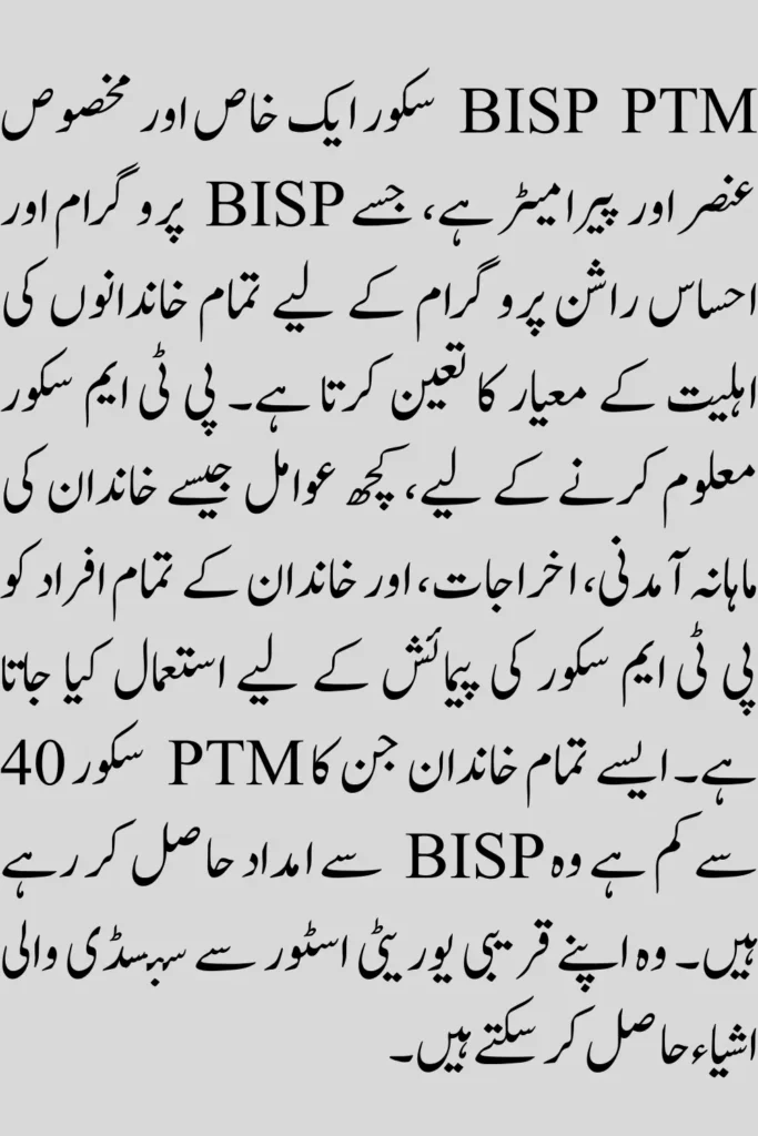 Under the BISP PTM Score, the government of Pakistan has decided to provide subsidized items for deserving low-income families registered under the Benazir Income Program and Benazir Kafalat Program. The utility store will provide these essential items on behalf of the government. In this case, you will be provided with this subsidy and free ration.
