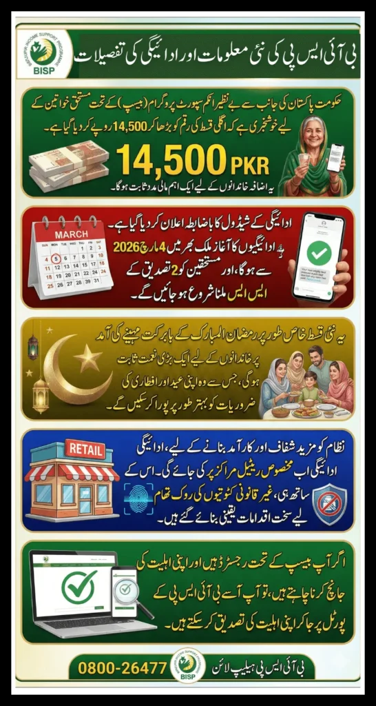 The BISP March 2026 Quarterly Payment Increased to 14500 Check Installment Date & Latest Implementations update is a major relief for deserving families across Pakistan. Starting from March 4, 2026, eligible women will receive Rs. 14,500 under the improved retail-based distribution system. With enhanced transparency, structured scheduling, biometric verification, and SMS alerts, the payment process has become more efficient and accessible. Beneficiaries are advised to follow official instructions, collect their full payment without deductions, and report any irregularities immediately. This quarterly assistance continues to play a vital role in supporting vulnerable households, especially during times of rising inflation and economic pressure.