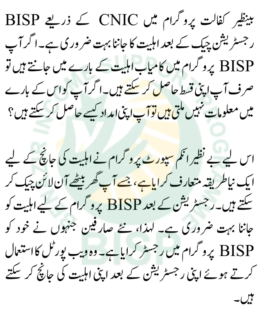 Therefore, the Benazir Income Support Program has introduced a new method to check eligibility, which you can check online at home. knowing the eligibility for the BISP program after registration is crucial. So, the new users who have registered themselves in the BISP program. They can check their eligibility after their registration using the web portal.