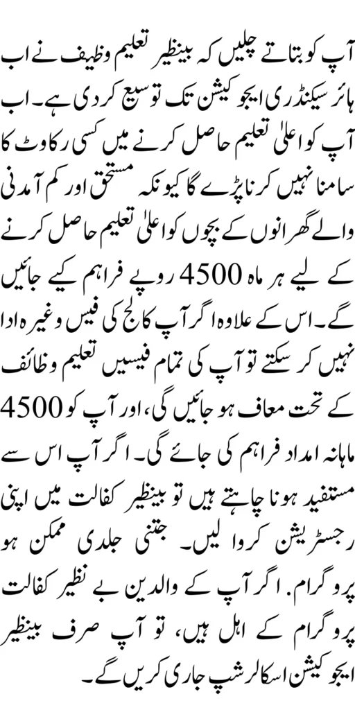 Then all your fees will waived under Taleemi wazaif, and you will provided with a monthly assistance of 4500. If you want to benefit from this, get your registration in the Benazir Kafalat program as soon as possible. If your parents are eligible for the Benazir Kafalat program, you will only issued the Benazir Taleemi Scholarship.