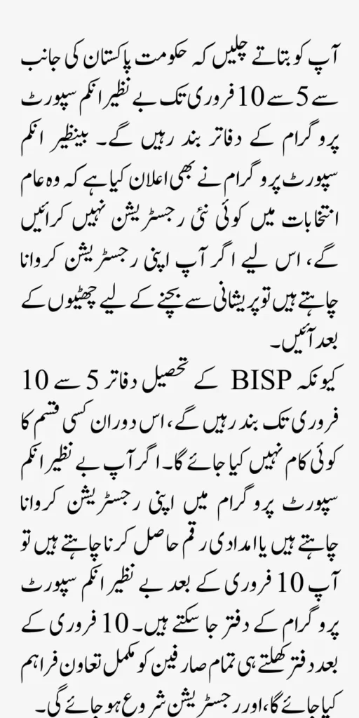 So get your registration done in the coming week, and don’t keep going back and forth to the Benazir Income Support Program office. The government of Pakistan has declared a holiday in all the institutions, so if you have to register yourself in the Benazir Income Support Program or find out the solution to other problems. You can approach the Benazir Income Support Program office after February 10 and find out the solution to your problems.