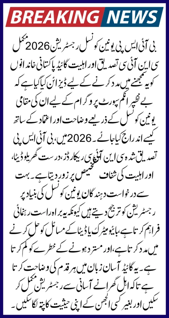 BISP Union Council Registration 2026 Complete CNIC Verification & Eligibility Guide is designed to help Pakistani families understand how to register for the Benazir Income Support Program through their local Union Council with clarity and confidence. In 2026, BISP places strong emphasis on verified CNIC records, accurate household data, and transparent eligibility evaluation. Many applicants prefer Union Council–based registration because it provides direct guidance, helps resolve biometric or data issues, and minimizes the risk of rejection.