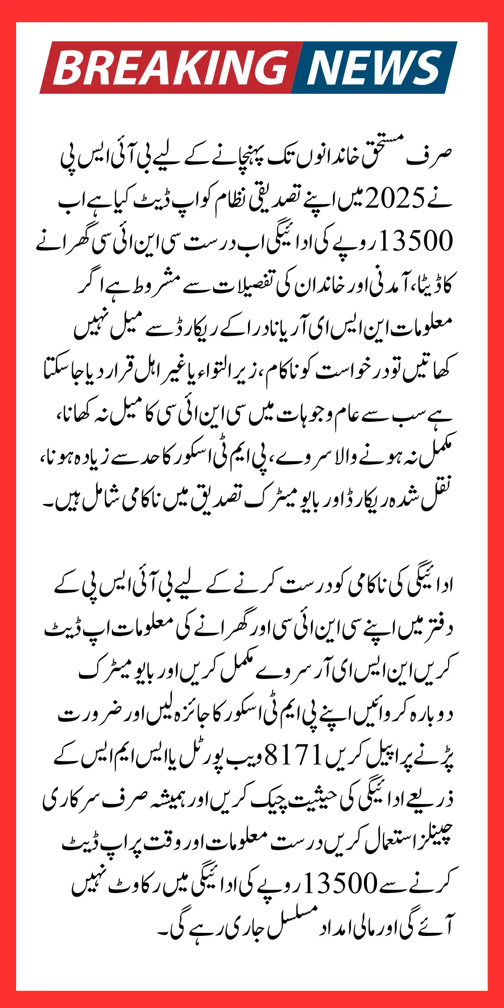 BISP Validation Failure Reasons: BISP has introduced updated validation processes in 2025 to ensure that financial assistance reaches only deserving households the Rs. 13,500 payment is now closely linked to accurate CNIC information household data income and family composition recorded in the National Socio-Economic Registry.