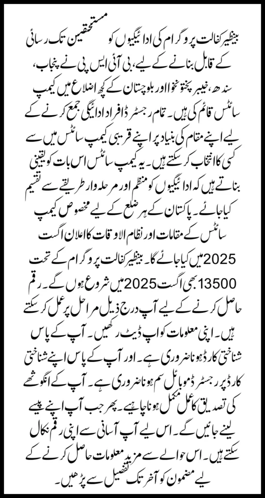 The 13500 under Benazir Kafalat program will also start in August 2025. You can follow the following steps to get money. Keep your information updated. You must have an ID card. And you must have a registered mobile SIM on your ID card. Your thumb verification process should be complete. Then when you go to collect your money. So you can easily withdraw your money.To get more information in this regard, read the article in detail till the end.
