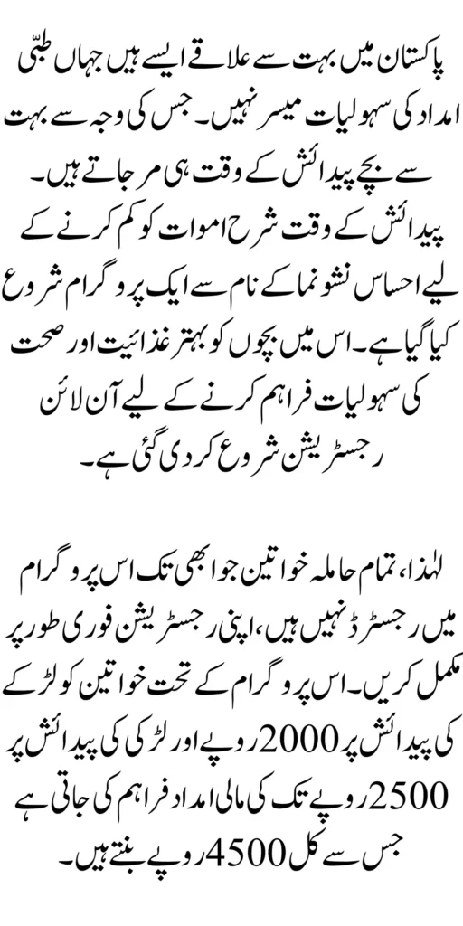 پاکستان میں بہت سے علاقے ایسے ہیں جہاں طبی امداد کی سہولیات میسر نہیں۔ جس کی وجہ سے بہت سے بچے پیدائش کے وقت ہی مر جاتے ہیں۔ پیدائش کے وقت شرح اموات کو کم کرنے کے لیے احساس نشونما کے نام سے ایک پروگرام شروع کیا گیا ہے۔ بچوں کو بہتر غذائیت اور صحت کی سہولیات فراہم کرنے کے لیے آن لائن رجسٹریشن شروع کر دی گئی ہے لہٰذا وہ تمام حاملہ خواتین جو ابھی تک اس پروگرام میں رجسٹر نہیں ہوئیں وہ فوری طور پر اپنی رجسٹریشن مکمل کریں۔ اس پروگرام کے تحت لڑکوں کو لڑکے کی پیدائش پر 2000 روپے اور لڑکی کی پیدائش پر 2500 روپے تک کی مالی امداد فراہم کی جاتی ہے جس سے کل 4500 روپے بنتے ہیں۔