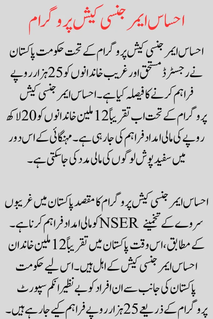 Ehsaas Emergency Cash Program: Under the Ehsaas Emergency Cash Program, the Government of Pakistan has decided to provide 25,000 rupees to registered deserving and poor families. Under the Ehsaas Emergency Cash Program, about 12 million families are now being provided financial assistance of 20 lakh rupees.