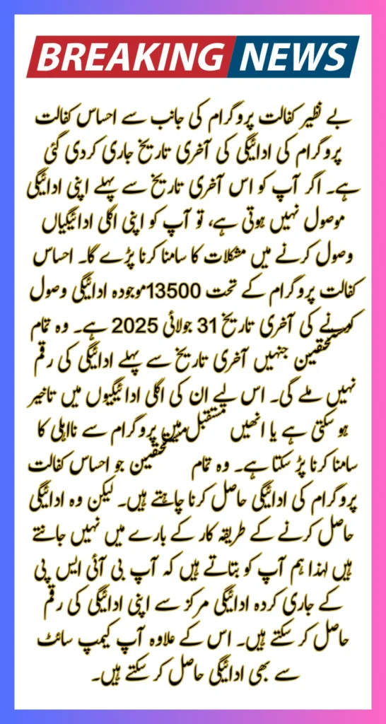 Ehsaas Kafalat Program Payment: The last date for payment of Ehsaas Kafalat Program has released by Benazir Kafalat Program. If you do not receive your payment before this deadline, you will face difficulties in receiving your next payments. 13500 under the Ehsaas Kafalat program, the last date to receive the current payment is 31 July 2025. All those beneficiaries who will not get their payment amount before the last date. So their next payments may delayed or they may face disqualification from the program in the future.