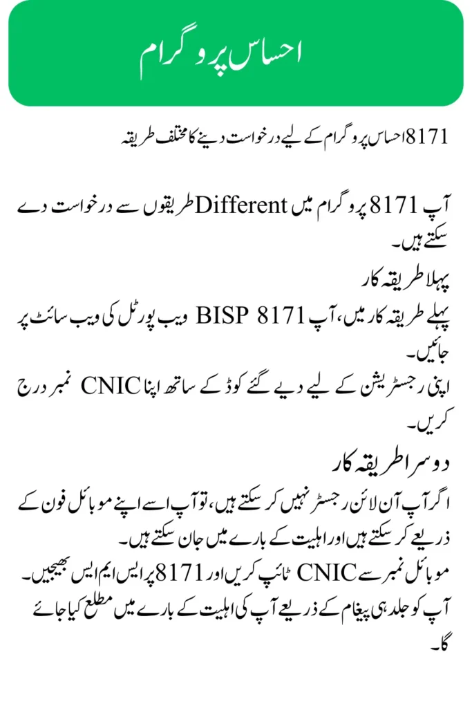 آپ اس 8171 ویب پورٹل پر جا کر اپنا CNIC نمبر اور فارم میں تمام معلومات درج کر کے رجسٹریشن مکمل کر سکتے ہیں۔ وہ لوگ جو دور دراز علاقوں میں رہتے ہیں یا انٹرنیٹ تک رسائی نہیں رکھتے۔ آپ اپنی رجسٹریشن کا عمل ایس ایم ایس پر 8171 کے ذریعے بھی مکمل کر سکتے ہیں۔ اور اہلیت کے بارے میں جان سکتے ہیں۔ حکومت نے اس پروگرام میں غریب اور مستحق لوگوں کو شامل کرنے کے لیے بہت سے اقدامات کیے ہیں.