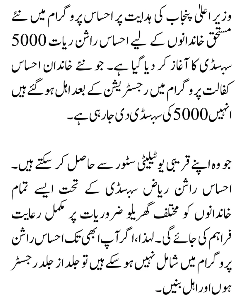 Ehsaas Rashan Riayat 5000: On the directives of the Punjab Chief Minister, the Ehsaas Rashan Riayat 5000 subsidy has been started for newly eligible families in the Ehsaas Program. Those new families who have become eligible after registration in the Ehsaas Kafalat program are being provided a subsidy of 5000.