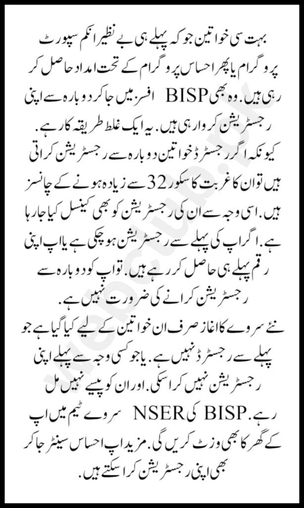 Many women already receive assistance under the Benazir Income Support Program or Ehsaas Program. She is also going to the BISP offices to get her registration done again. This is a flawed procedure because if registered women re-register, there is a chance that their poverty score will be higher than 32. For this reason, their registration is also being cancelled. If you have already registered or are already receiving your payment, you do not need to register again.