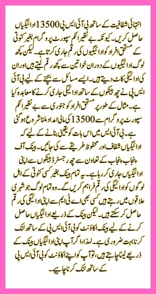 There are some individuals in the Benazir Income Support Program who face difficulties while receiving the payments. Among these difficulties, the biggest difficulty is that the verification of the fingerprints of some women cannot done. Because of which six banks have included in the program as partners through the Benazir Income Support Program. So that all people can get their payment amount without any problem and fraud. 13500 issued by BISP to you if you are underpaid. So you can call the official number of Benazir Income Support Program and register your complaints.