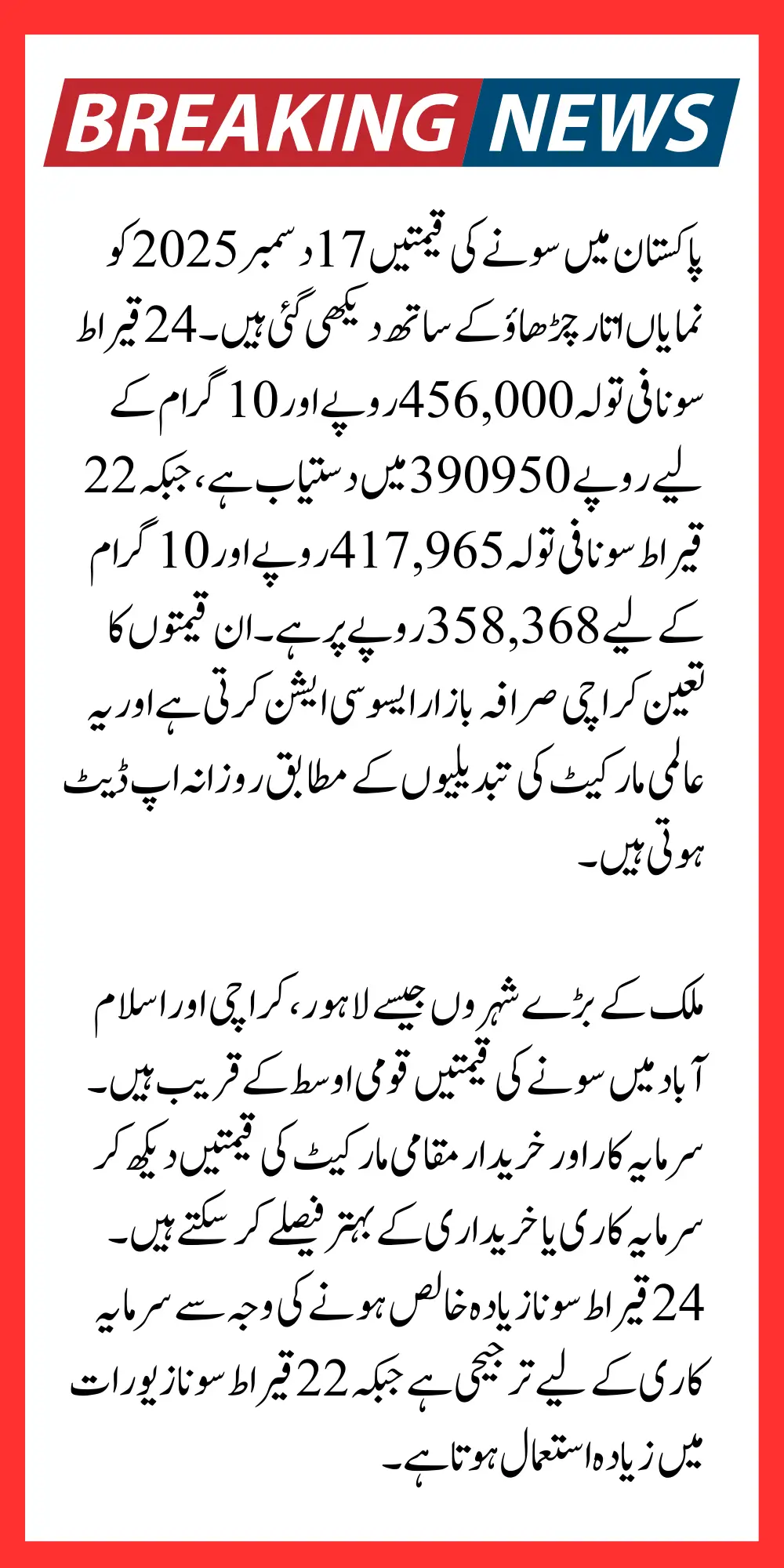 According to UrduPoint, gold prices in Pakistan have experienced noticeable changes recently, reflecting fluctuations in both international markets and local demand. As of 17 December 2025, 24k gold is priced at Rs 456,000 per tola and Rs 390,950 per 10 grams, while 22k gold is Rs 417,965 per tola and Rs 358,368 per 10 grams. Staying updated through reliable sources like UrduPoint helps investors, traders, and buyers make informed decisions, whether for investment, trading, or purchasing jewelry. For more detailed and real-time updates, readers can visit the official UrduPoint website.
