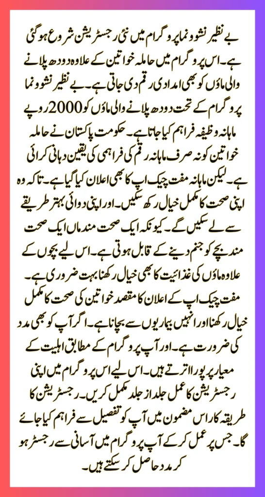 Pregnant women get Rs.2000 per month after being eligible for the Benazir Nashonuma Program. Through which they are helped to a great extent. Even after the birth of the child, money is provided to them. If a woman gives birth to a son, 2500 rupees is given to the child and 3000 rupees for the birth of a daughter. So that women can improve their diet and medicine even after giving birth. Because it is very important for the health of both mother and child.
