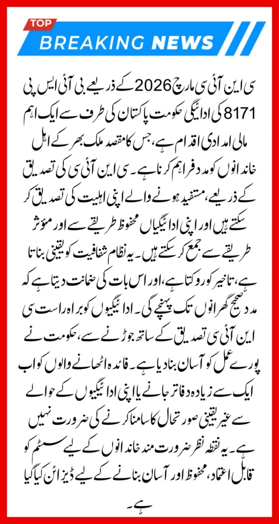 The BISP 8171 March 2026 payment forms part of the ongoing welfare assistance program, targeting registered households. Only families whose CNIC details are validated in the official BISP database can receive payments, ensuring accuracy and fairness in distribution.