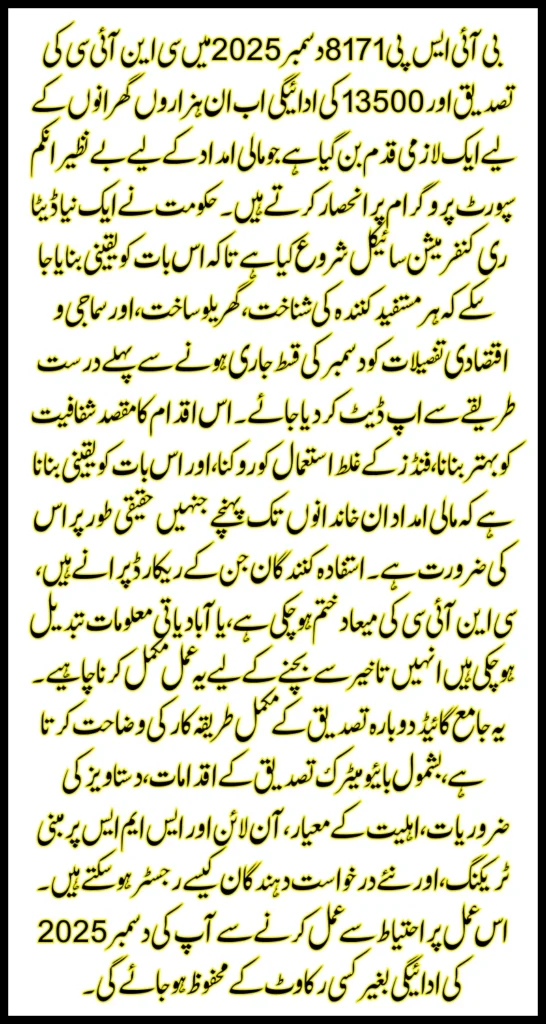 BISP Reconfirmation For December: The BISP 8171 December 2025 reconfirmation for CNIC verification and the Rs. 13,500 payment has now become a mandatory step for thousands of households that rely on BISP for financial assistance the government has launched a new data reconfirmation cycle to ensure that every beneficiary’s identity, household composition, and socio-economic details are accurately updated before the release of the December installment.