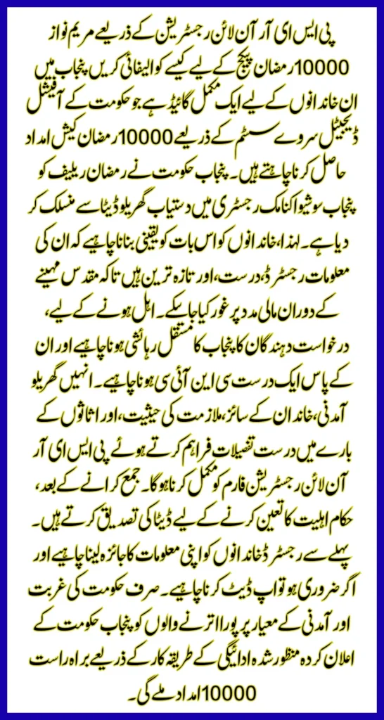 How to Qualify for Maryam Nawaz 10000 Ramzan Package Through PSER Online Registration is a complete guide for families in Punjab who want to receive the Rs 10,000 Ramzan cash assistance through the government’s official digital survey system. The Punjab government has linked Ramzan relief to verified household data available in the Punjab Socio-Economic Registry (PSER). Therefore, families must ensure that their information is registered, accurate, and up to date in order to be considered for financial support during the holy month.