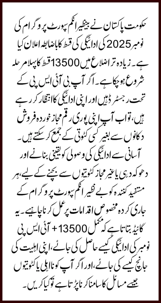 This guide explains how to receive the full Rs. 13,500 BISP November payment, how to check your eligibility, and what to do if you face problems like ineligibility or deductions.