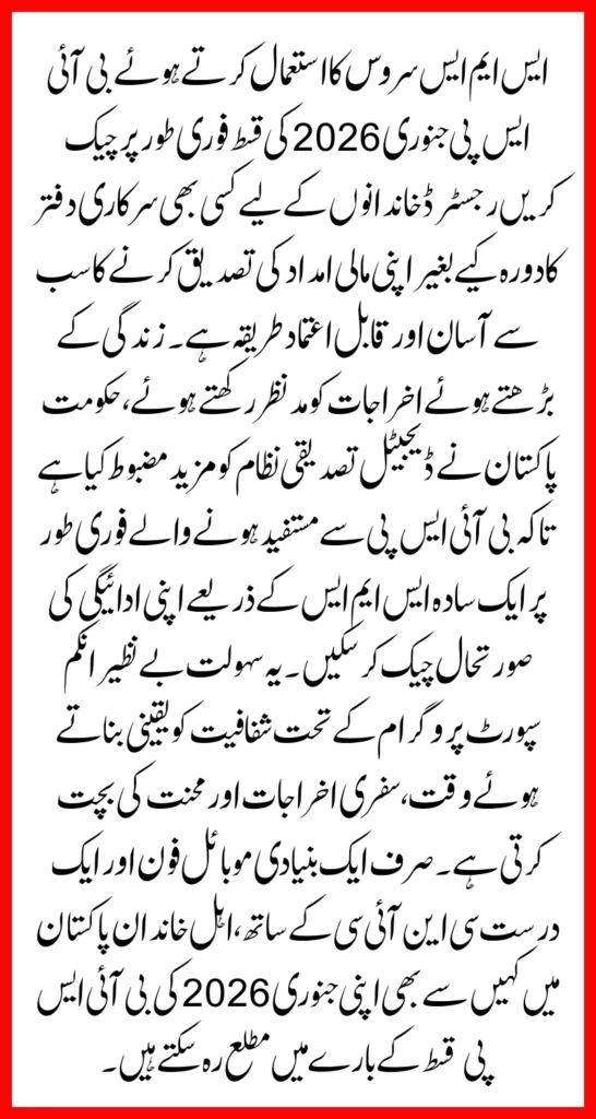 This facility saves time, travel expenses, and effort while ensuring transparency under the Benazir Income Support Program. With just a basic mobile phone and a valid CNIC, eligible families can stay informed about their January 2026 BISP installment from anywhere in Pakistan.