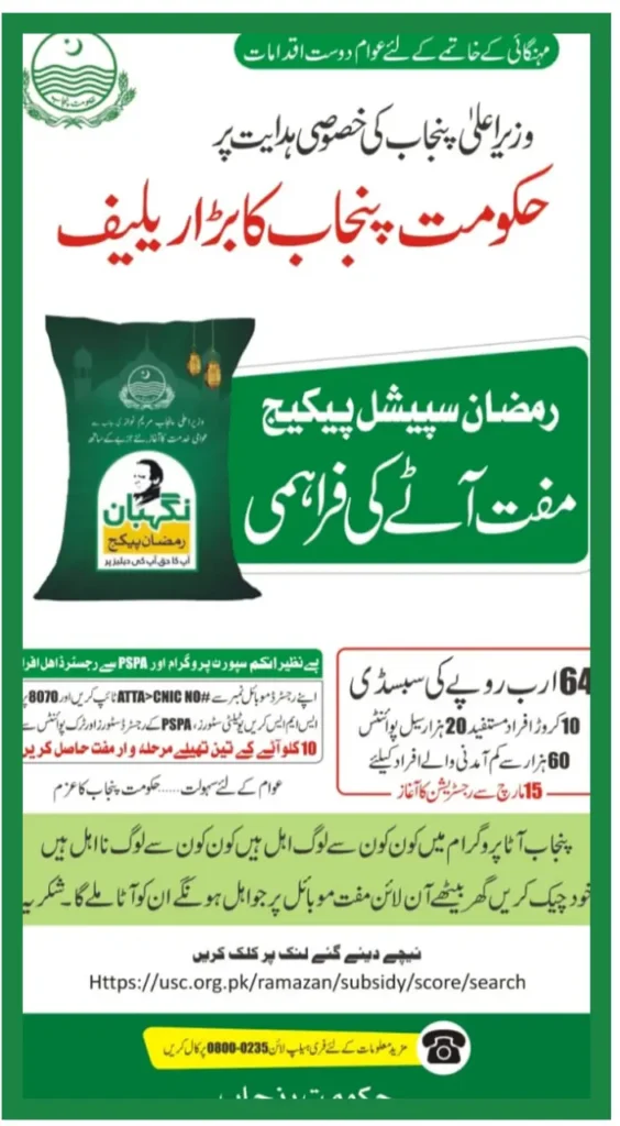 Chief Minister Punjab has announced that three free bags of flour will be provided to deserving and poor families during Ramadan under the Negahban Free Atta Scheme. The Punjab government has also said the survey will start in one or two days.
