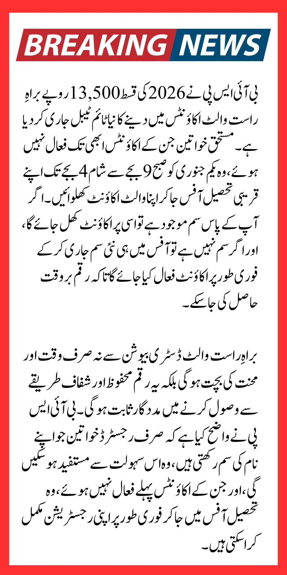 بی آئی ایس پی کی چیئرپرسن نے آج کی اہم میٹنگ میں حتمی اعلان کیا ہے کہ 2026 کی قسط اب براہِ راست والٹ اکاؤنٹ میں ہی منتقل کی جائے گی۔ جن خواتین کے اکاؤنٹ ڈیڈ لائن گزرنے کی وجہ سے ابھی تک نہیں کھل سکے، وہ بالکل پریشان نہ ہوں کیونکہ ان کے لیے خصوصی سہولت دے دی گئی ہے۔