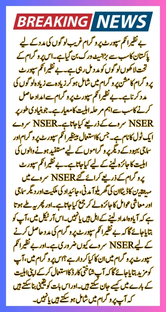 The NSER survey is conducted to determine eligibility for Benazir Income Support Program assistance. It is a complete comprehensive data. Which acts as an important tool for identifying poor and deserving families by the government. And identifies those who need assistance. In this survey, information is collected about the social and economic status of the families of Pakistan. Which includes proof of family income, nature of education, property ownership and health related factors. By collecting all this information, the poverty score of the deserving people is identified.