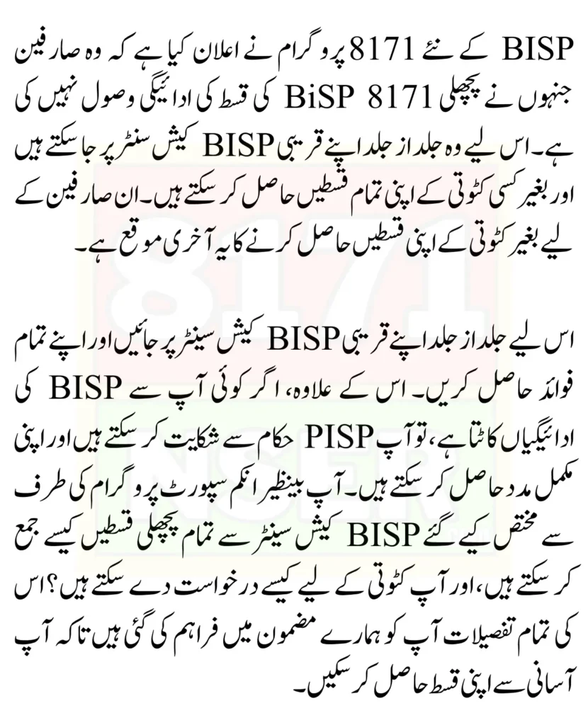 If you are a customer who has not been able to receive your previous BISP 8171 payment for a long time, the complete procedure for combining all these payments is provided below.