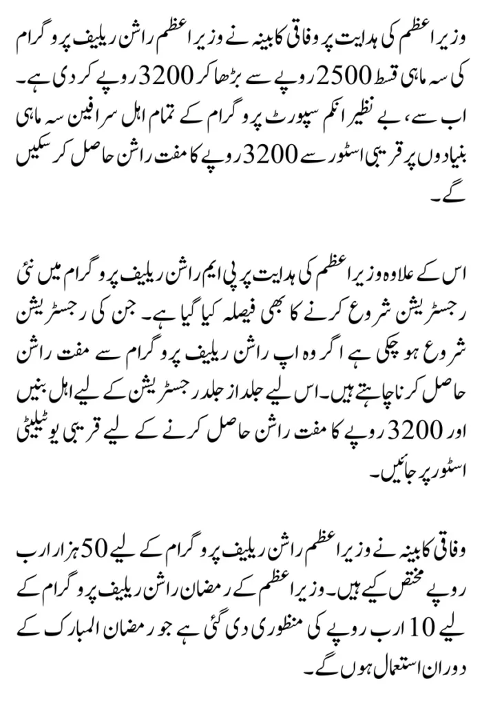 On the instructions of the Prime Minister, the Federal Cabinet has increased the quarterly installment of the PM Rashan Relief Program from Rs.2500 to Rs.3200. From now on, all Benazir Income Support Program eligible people will be able to get a free Rashan of Rs 3200 from the nearest store on a quarterly basis.