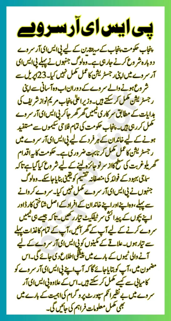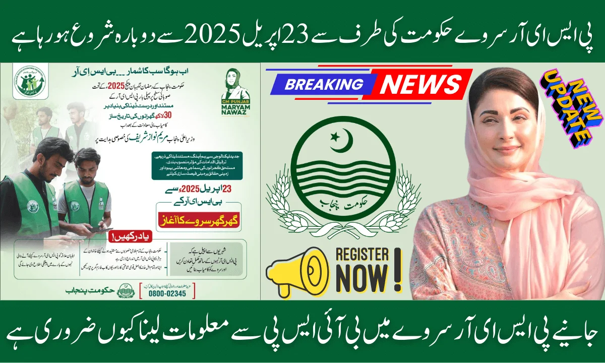 PSER survey restarts from 23rd April 2025 by the government. The Punjab government is starting regular re-registration in the PSER survey from April 23. Households who have not registered for the PSER survey before can register themselves from the registration starting from April 23. Teams will visit the areas of the eligible persons to conduct the survey. So, information is provided in advance in the areas where the survey teams will visit. It is important for those who want to complete their survey to have all their documents ready in advance.