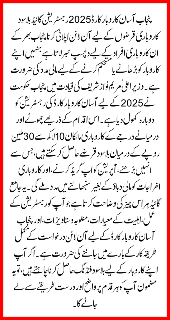 Punjab Asaan Karobar Card 2025 Registration Guide Apply Online for Interest-Free Business Loans brings exciting news for entrepreneurs across Punjab who need financial assistance to expand or stabilize their businesses. The Punjab government, led by Chief Minister Maryam Nawaz Sharif, has reopened the Asaan Karobar Card registration for 2025. Through this initiative, small and medium business owners can receive interest-free loans between Rs 1 million and Rs 30 million, helping them grow, upgrade operations, and manage business expenses without financial stress.
