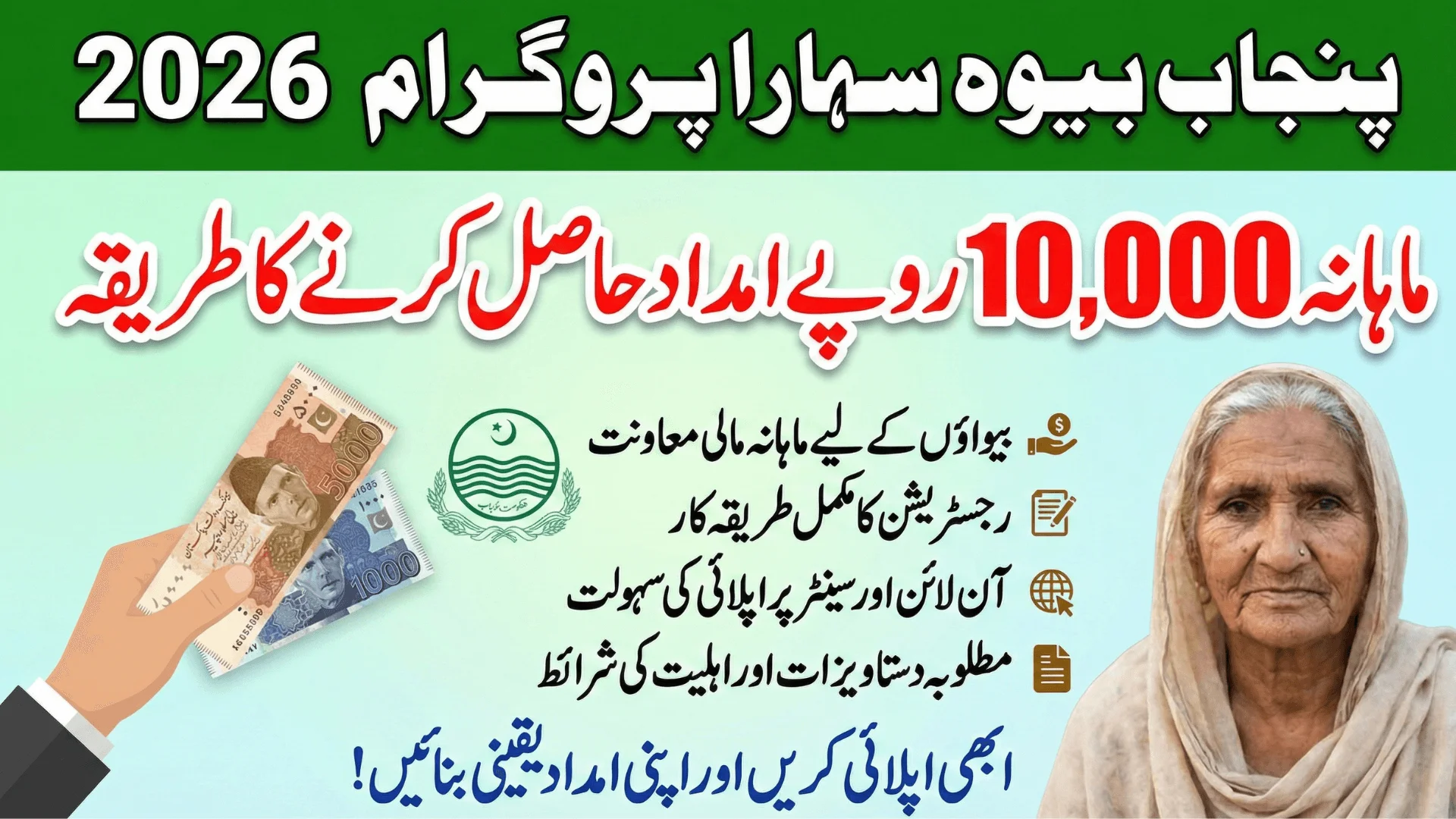 Punjab Bewa Sahara Program: The application procedure for the Punjab Bewa Sahara Program 2026 has released by the Government of Pakistan. Women who register for this program will be provided with a monthly assistance of Rs. 10,000. This program has introduced especially for women who are widows and are struggling to meet their household expenses in view of rising inflation. With the continuous increase in food prices, utility bills, children’s school fees and medical expenses, many widows in Punjab are facing severe financial problems after losing their main earning family member. This program has created to provide assistance to widows. This program verifies eligible women through a transparent and technology-based system and provides a monthly assistance of Rs. 10,000 to these women.