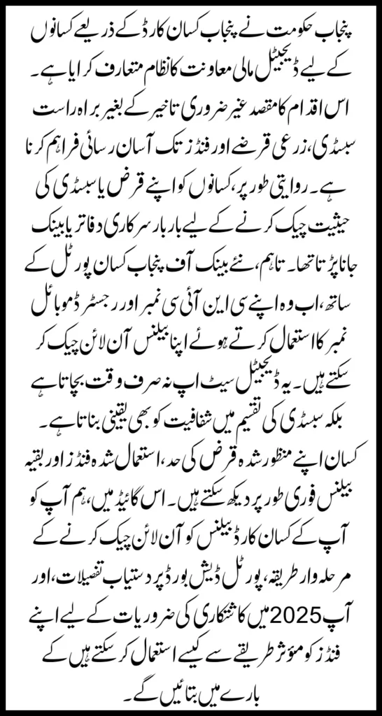 Punjab Kisan Card: The Punjab government has introduced a digital financial support system for farmers through the Punjab Kisan Card. This initiative aims to provide direct subsidies, agricultural loans, and easy access to funds without unnecessary delays. Traditionally, farmers had to visit government offices or banks repeatedly to check their loan or subsidy status. However, with the new Bank of Punjab (BOP) Kisan Portal, they can now check their balance online using their CNIC number and registered mobile number. This digital setup not only saves time but also ensures transparency in subsidy distribution. Farmers can view their approved loan limit, used funds, and remaining balance instantly. In this guide, we will walk you through the step-by-step method of checking your Kisan Card balance online, details available on the portal dashboard, and how you can effectively use your funds for farming needs in 2025.