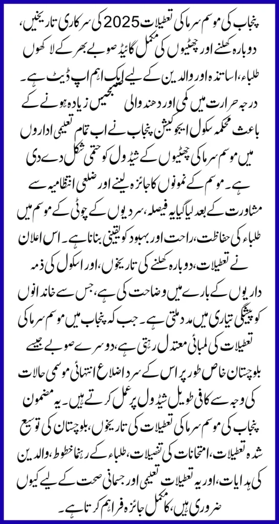 Punjab’s official winter vacation schedule for 2025 brings timely clarity for families and institutions. While Punjab enjoys a shorter but well-planned winter break, Balochistan’s colder regions require extended holidays due to extreme weather conditions. Whether it’s rest, revision, safety, or planning, winter vacations serve as an essential period for students, parents, teachers, and school administrations. Families are encouraged to use this time wisely, stay warm, and prepare for the upcoming academic term.