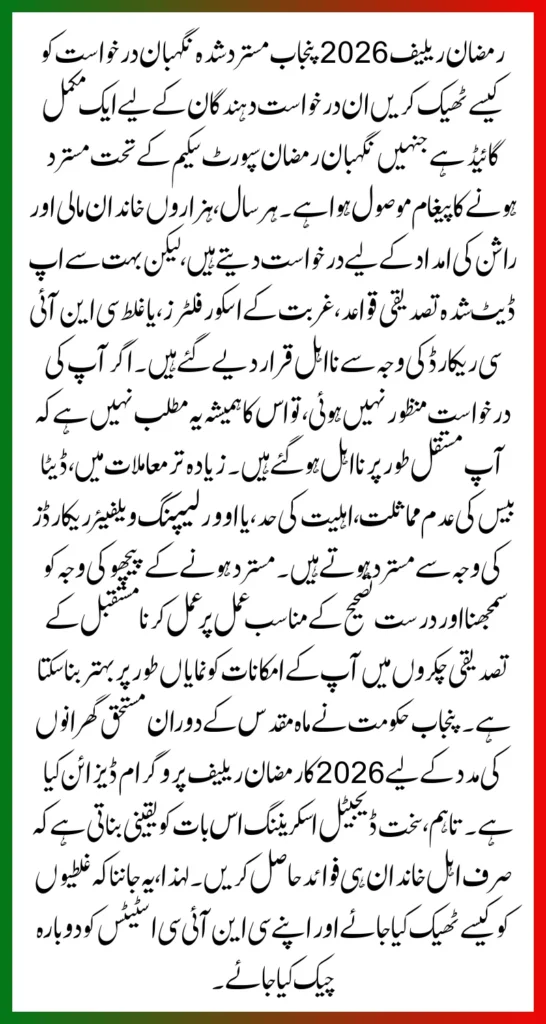 Ramzan Relief 2026 Punjab How to Fix Rejected Nigehban Application is a complete guide for applicants who have received a rejection message under the Nigehban Ramadan support scheme. Every year, thousands of families apply for financial and ration assistance, but many are marked ineligible due to updated verification rules, poverty score filters, or incorrect CNIC records. If your application was not approved, it does not always mean you are permanently disqualified. In most cases, rejections occur because of database mismatches, eligibility thresholds, or overlapping welfare records.